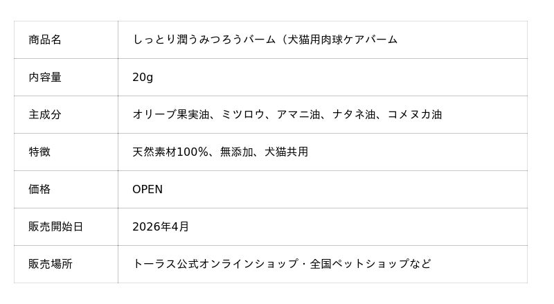 トーラス株式会社(本社:神奈川県綾瀬市、代表取締役:赤津徳彦)は、愛犬・愛猫の肉球を乾燥や外部刺激から守る足裏ケア商品「しっとり潤うみつろうバーム」を2026年4月に発売いたします。
