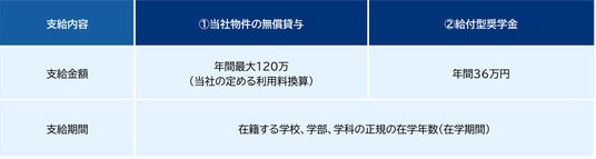 本制度では、「当社物件の無償貸与」・「給付型奨学金」の2種類から支給内容をお選びいただけます。応募資格・選考方法・スケジュールの詳細につきましては、特設ページより、ご確認いただけます。