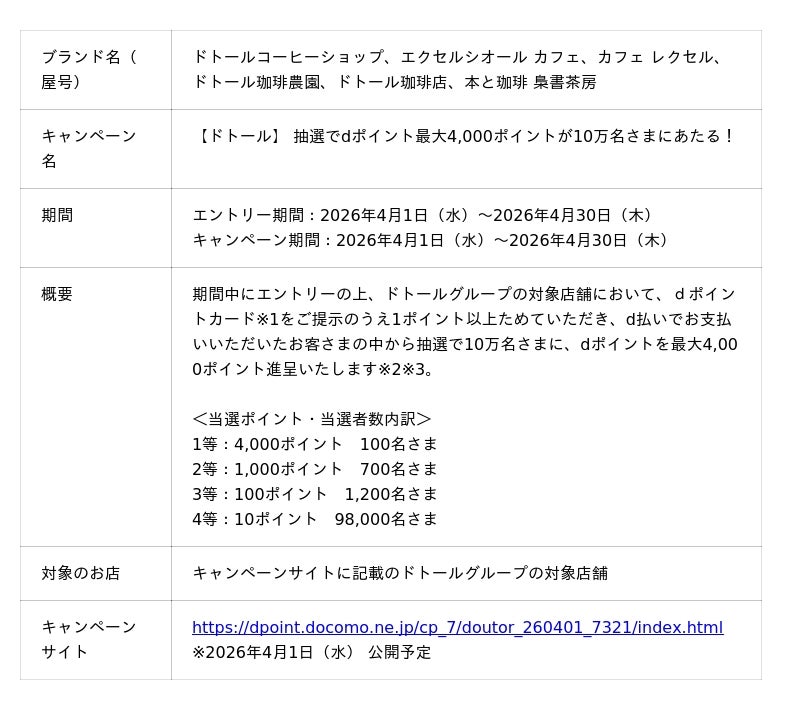 株式会社NTTドコモ(以下、ドコモ)は、ドトールグループにおいて、「抽選でdポイント最大4,000ポイントが10万名さまにあたる!(以下、本キャンペーン)」を2026年4月1日(水)から2026年4月30日(木)まで開催いたします。