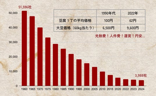 失われつつあるのは食文化だけではありません。豆腐のつくり手はそれ以上に厳しい状況に直面しています。大豆の価格・光熱費・人件費・容器代に至るまであらゆる製造コストが上昇する一方で、付加価値を失い価格でしか競争できない豆腐業界は、危機的なスピードで衰退しています。70年前には5万社を超えていた豆腐事業者の数は、足元で4,000社を割り込みました。大規模な工場で大量生産する大手メーカーの安値攻勢に耐えきれず、地域の事業者は淘汰され続けています。価格以外で差別化できないものづくりには、やりがいも生まれません。次の世代に引き継ぎたい仕事たりえないことも、衰退の大きな要因です。和食の価値を支えてきた豆腐屋は、その誇りを失っているのです。