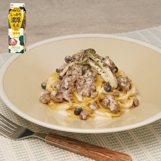 生クリーム要らず!? ワンパンクリームボロネーゼ/200円相当ポイント生クリーム・バターは不使用! 「しっかり特濃4.4 1000ml」があれば、シンプルな材料でも濃厚でコクのあるクリームパスタが簡単に作れます! 洗い物も少ないワンパンレシピですので、ぜひお試しください。