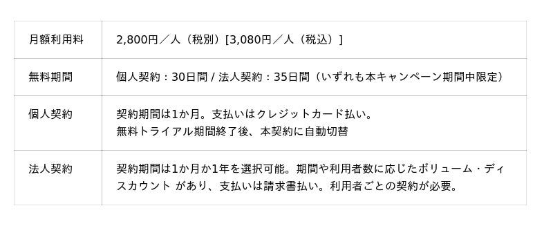 - 内容: 期間中に個人・法人契約で新規登録したユーザーを対象に、無料トライアル期間20日間延長クーポンを提供します。個人会員登録時にクーポンコード(以下キャンペーンに記載)を入力すると無料トライアルが通常の10日間から「30日間」へ拡大、クーポンコードや利用方法は以下キャンペーンサイトに掲載します(法人契約の場合は「35日間」へ拡大)。