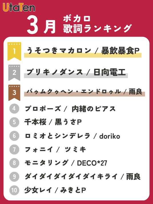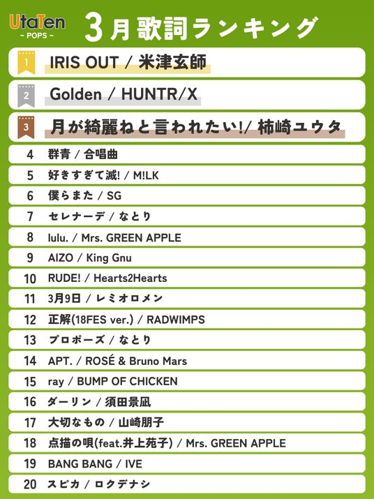 歌詞・音楽情報メディア「UtaTen(うたてん)」は、2026年3月度の「UtaTen月間歌詞ランキング」を発表しました。
