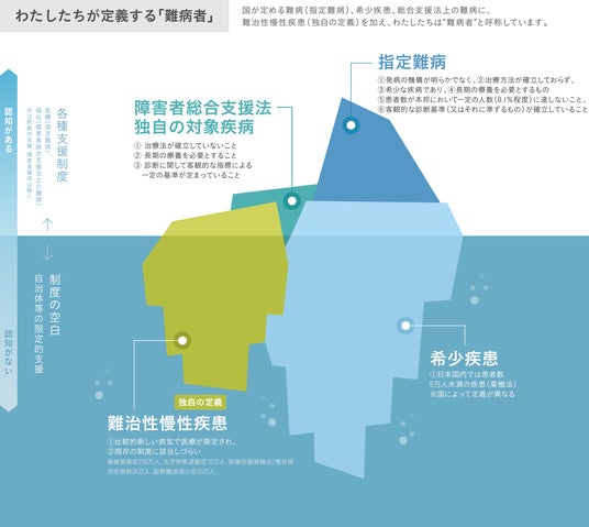 現代社会において、難病者は、既存の支援制度の枠組みからこぼれ落ちてしまうことが少なくありません。私たちはこの現状を「氷山モデル」に例えています。表面化している難病の陰には、診断の有無に関わらず症状に苦しむ難病の人々が隠れています。