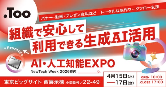クリエイティブ市場の総合商社・株式会社Too(本社/東京都港区虎ノ門3-4-7、社長/石井剛太、以下Too)は、「NewTech Week 2026春」内で開催される「第10回 AI・人工知能EXPO 春」に出展します。ブースでは、「組織で安心して利用できる生成AI活用」をテーマに、「Adobe Firefly」と「Acrobat Studio」を基盤とした、効率的な制作プロセスの構築をご提案します。