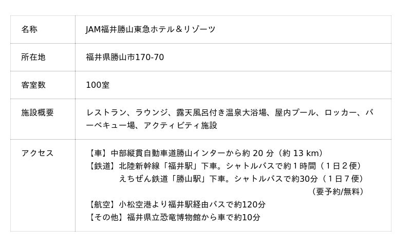 「JAM福井勝山東急ホテル&リゾーツ」は、四季を通じて自然を満喫できる高原リゾート「JAM福井勝山マウンテンリゾート」のオフィシャルホテルとしてリブランドオープンしました。「JAM福井勝山マウンテンリゾート」は、グリーンシーズンには緑豊かな高原でのアクティビティや手ぶらで楽しめるバーベキュー場、福井土産やアウトドアブランドのアパレルが揃うショップなど、一日中自然の中で過ごすことができ、ウィンターシーズンには最長滑走距離5,800メートル、全16コースを誇る西日本最大級のスキー場で思いきりスキーを楽しむことができる通年型マウンテンリゾートです。