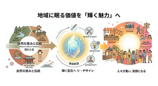 私たちは、その「原石」に光をあて、魅力を再発見し、価値を磨き上げることで、受け取り手の心を輝かせます。それが地域の活力となり、日本の元気に繋がると信じ、「社会課題と経済課題を同時に解決する事業づくり」に本気で取り組んでいます。