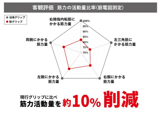 試験の結果、新グリップの方が従来のグリップに比べて筋力活動量を10%削減できたことがわかりました。さらに被験者に行ったアンケート評価では握った時の手の負担や痛みが減ったという結果となりました。