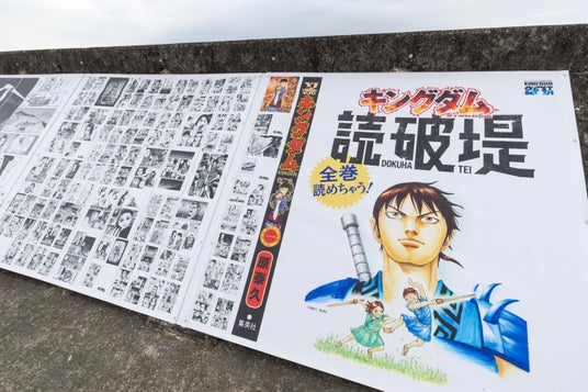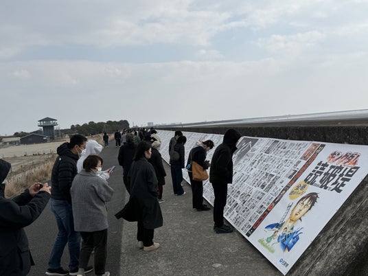 有明海沿いの防波堤に、コミックス1巻から77巻までの全ページを掲出。その長さは全長300mを超える、前代未聞の無料公開。