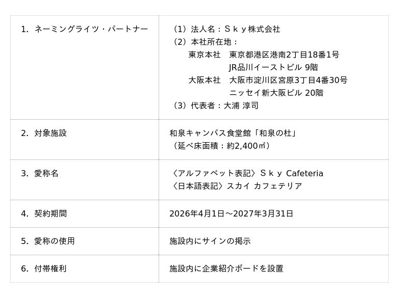 このたび、本契約により命名権を付与する施設は、和泉キャンパス 食堂館「和泉の杜」(以下、「本施設」)で、2026年4月1日から1年間、本施設の愛称は「Sky Cafeteria」となります。明治大学における初めてのネーミングライツ施設になります。