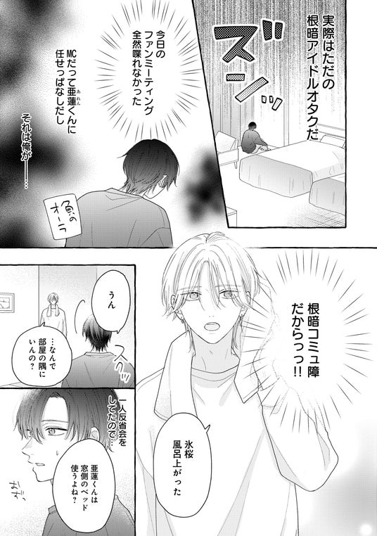 憧れを胸に秘めて活動を続けていたある日、氷桜はメンバーの亜蓮(あれん)とホテルが同室でありながら、風呂場でこっそり自慰をしてしまう。