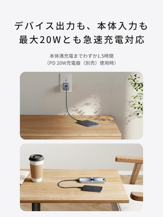 ワイヤレスだけでなく、最大20Wの有線出力(USB-C)にも対応しているため、急ぎの充電にも対応可能。シーンに応じて使い分けができます。また、パススルー充電にも対応しており、本体を充電しながらスマートフォンへ給電できるのも便利なポイントです。