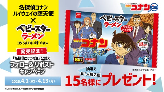 ナゾトキを制作した「名探偵コナンゼミ」の公式Xにて、『名探偵コナン ハイウェイの堕天使×ベビースターラーメン(コクうまチキン味)6袋入』が抽選で15名様に当たるキャンペーンを実施します。