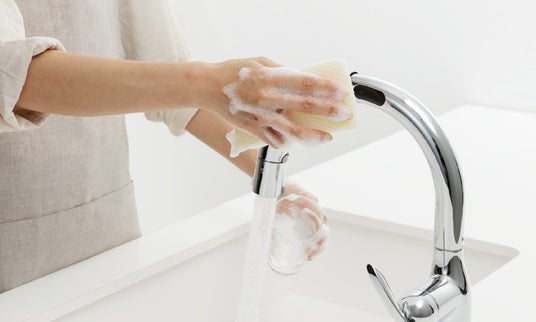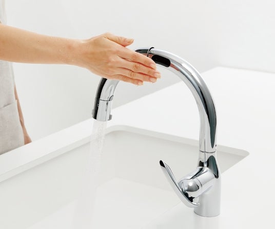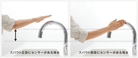 蛇口の側面にセンサーを配置することで、腕を大きく持ち上げたりひねったりする動作を抑え、自然な姿勢で操作できます。あわせて、手をかざした際に水や洗剤が水栓に垂れにくく、水仕事後の拭き取りの手間を軽減し、清潔な状態を保ちやすくします。