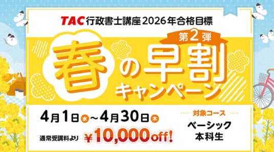行政書士試験対策講座を展開しているTAC株式会社(東京都千代田区)は、2026年合格目標で春から学習スタートするコース『ベーシック本科生』を4月より全国TAC校舎で開講します。また、初学者の方もオトクに始められる『春の早割キャンペーン第2弾』を4/1(水)~4/30(木)で実施します。