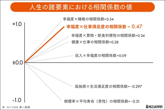 またミズカラが2025年の8月~10月に実施した「幸福度と仕事満足度の相関係数」調査によれば、仕事満足度と幸福度の相関係数は0.47と「非常に高い関連性を持つ」ことが判明しました。相関係数とは、2つの要素の関係性を表す指数で「片方が上がった時にもう一方が連動して上がる度合い」を数値化したものです。