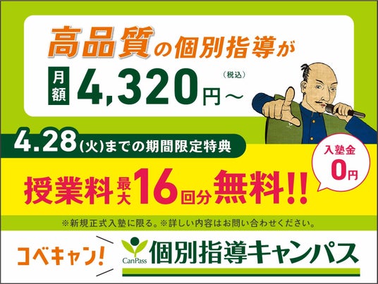 「コベキャン」「キャンパス」の愛称でおなじみの個別指導キャンパスは、低価格で高品質な個別指導塾です。他の個別指導塾の6割程度の授業料を創業当初から維持しています。大阪・兵庫・京都・滋賀・奈良・愛知・愛媛・東京・千葉・埼玉・福岡に直営校舎を展開中。成績が上がらなければ3ヶ月間授業料免除となる成績保証制度を業界でもいち早く導入し、「絶対に成績を上げる」をモットーに、地域に密着した教室展開をしています。当塾の8割が友人同士の紹介や口コミからのご入塾で、高い評価をいただいております。