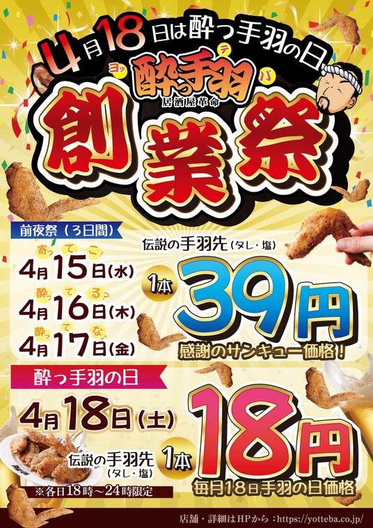 「居酒屋革命 酔っ手羽(よってば)」は、創業日かつ、ブランド名にちなんだ4月18日を「酔っ手羽記念日」とし、日頃のご愛顧への感謝を込めた一大イベント「酔っ手羽 創業祭」を4月15日から開催。