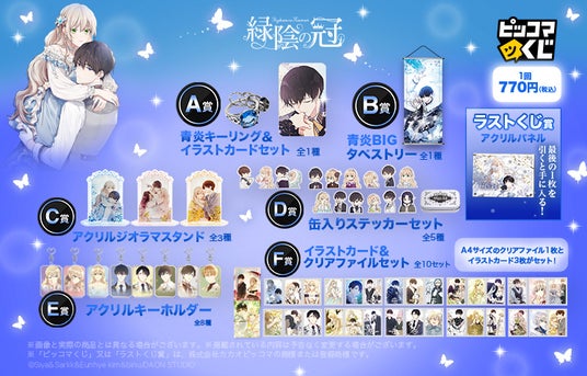 A賞とB賞には、ラチア公爵家を象徴する「青炎」をモチーフにした重厚なキーリング&イラストカードセットやタペストリーを。ランとユスタフの甘い名シーンを再現したアクリルジオラマスタンドなど、たくさんの思い出が蘇るイラストアイテムもぜひお手元にお迎えください。・作品名:緑陰の冠