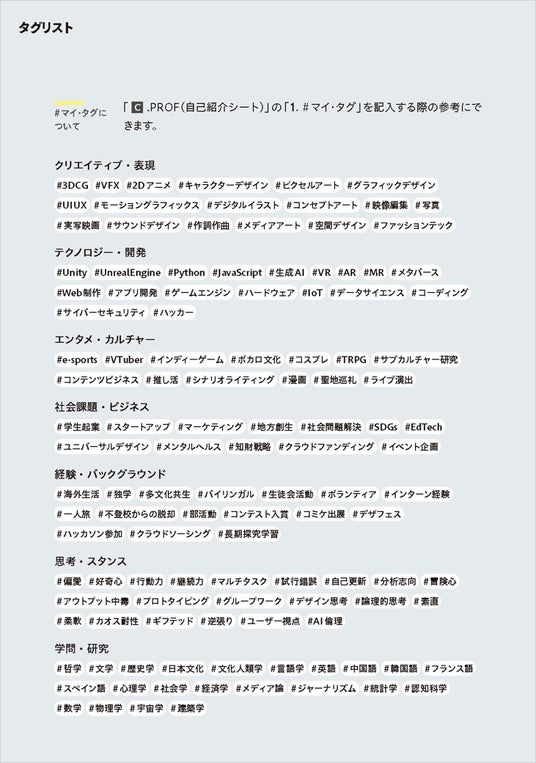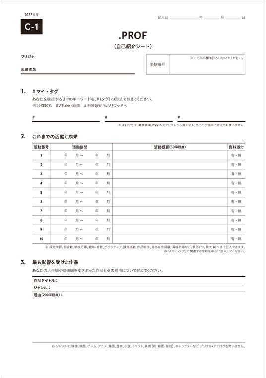これに伴い、「志望理由書」や「活動記録報告書」などの本学書式を見直します。#マイ・タグをはじめ、受験生の偏愛の履歴を記載するための書類として、「PROF.(自己紹介シート)」を導入します。PROF.には、#マイ・タグとそのタグをつけるに至るまでの活動についての記録、最も影響を受けた作品とその理由、入学後のビジョンについて記入欄を設けました。