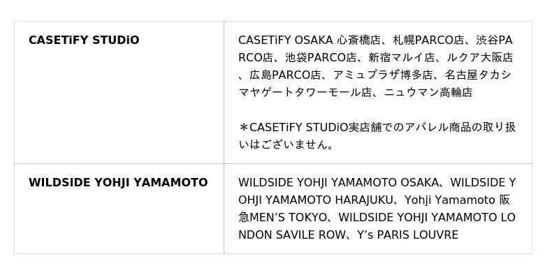 また、国内のCASETiFY STUDiO各店舗およびWILDSIDE YOHJI YAMAMOTO取り扱い各店舗にて、2026年4月10日(金)各店舗オープン時間より販売を開始いたします。