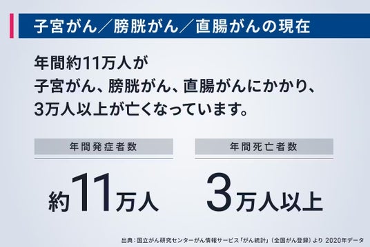 子宮がん、膀胱がん、直腸がんなどの骨盤内がんは、日本において毎年約11万人が新たに診断され、3万人以上の患者さんが命を落としています。