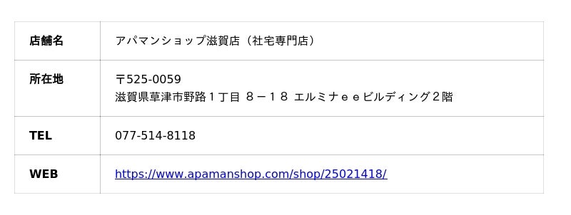 賃貸住宅仲介業店舗数No.1*のアパマンショップを展開するAPAMAN株式会社(本社:東京都中央区、代表取締役社長:山崎 戒/EL CAMINO REAL株式会社の連結子会社)は、アパマンショップ加盟企業である株式会社エルアイシー(本社:静岡県富士市)が、法人向け社宅斡旋に特化した「アパマンショップ滋賀店(社宅専門店)」を2026年4月1日(水)に新規開設したことをお知らせします。