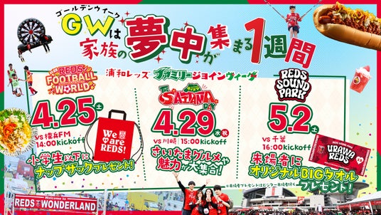 今年のGWは4/25(土)・29(水・祝)・5/2(土)の3試合連続で、埼スタでのホームゲームを開催!来場するたびに楽しみが変わり、3日とも家族で1日中楽しめる特別企画を実施。初観戦でももちろんOK!さらに、1万名以上にプレゼントが当たる抽選会「REDSジャンボ」&多彩なイベント満載などの3日です!