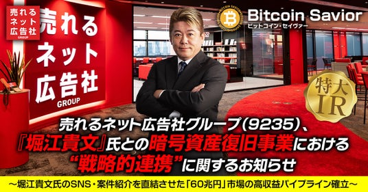 売れるネット広告社グループ株式会社(本社:福岡県福岡市、代表取締役社長 CEO:植木原宗平、東証グロース市場:証券コード9235、以下 売れるネット広告社グループ)は、連結子会社であるビットコイン・セイヴァー株式会社が提供する暗号資産(仮想通貨)復旧サービスにおいて、『堀江貴文』氏との間で、“暗号資産(仮想通貨)復旧案件の継続的な創出”に向けた“戦略的連携”を開始したことをお知らせいたします 。