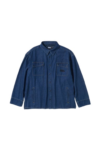 ワークウェアのタフなディテールと、洗練された都会的なシルエットを融合したデニムシャツジャケット。フロントとサイドに立体感のあるフラップ&スラッシュポケットを配置し、実用性とデザイン性を両立。背中にはアクションプリーツを取り入れ、動きやすさを確保しながら、ラフすぎない印象に。裾はわずかにラウンドさせたスリット入りで、レイヤードした際のシルエットにも配慮しています。配色ステッチとオリジナル刺繍ロゴが、無骨さの中にブランドらしい存在感を添えています。