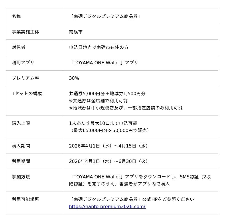 フェリカポケットマーケティング株式会社(東京都文京区、代表取締役:納村哲二、以下当社)は、富山県南砺市が国の重点支援地方交付金を活用して実施する「南砺デジタルプレミアム商品券」について、2026年4月1日(水)より、市民を対象とした商品券の購入および利用を開始しましたので、お知らせいたします。