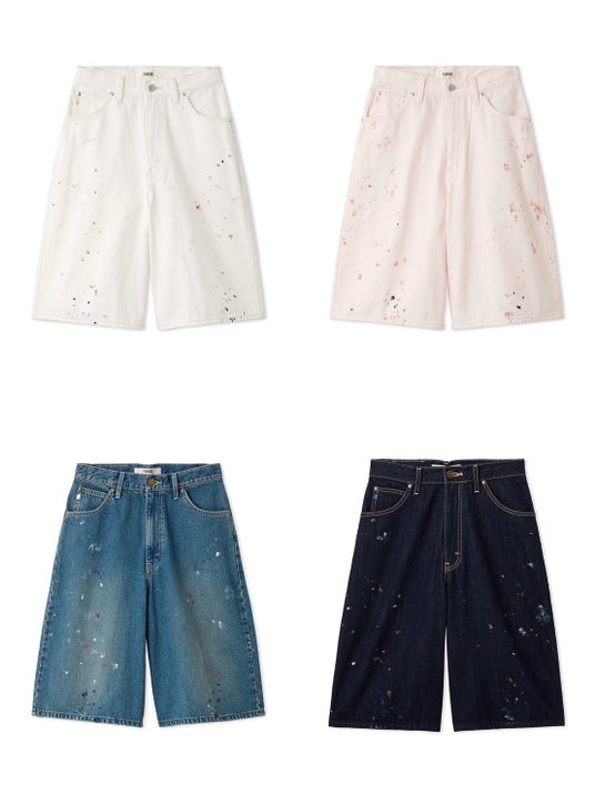 ステッチの効いたスタンダードなシルエットのオーバーオールと、ランダムなハンドペイントが遊び心をくすぐるハーフパンツの2型をラインナップ。