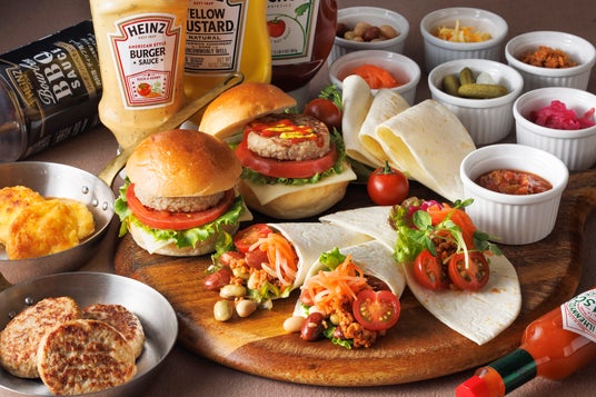 バンズ(ロールパン)/トルティーヤ/チキンナゲット/ミニハンバーグ/フィッシュフライ/たまごサラダ/フリルレタス/スライストマト/オニオンリングフライ/スイートレリッシュ/ミックスチーズ/ソース(ケチャップ・バーガーソース・イエローマスタード・BBQソース)