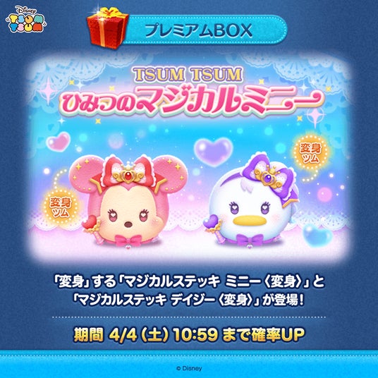 4月1日(水)より、ゲーム内イベント「TSUM TSUM ひみつのマジカルミニー」が開催されます。本イベントではミッションをクリアして5つのジュエルの色を変化させることで、物語が次々と展開していきます。クリアしたお話の数に応じて、「ピンズ」※がもらえます。