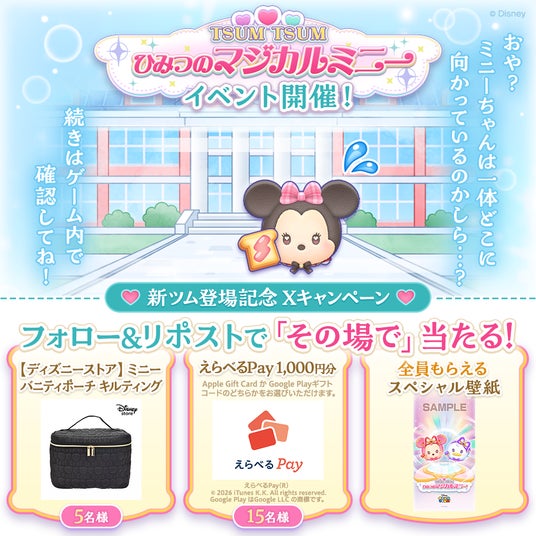 「TSUM TSUM ひみつのマジカルミニー」イベントの新ツム登場を記念して、『LINE:ディズニー ツムツム』公式X(旧Twitter)アカウントにて、抽選でその場で賞品が当たるXフォロー&リポストキャンペーンを開催します。