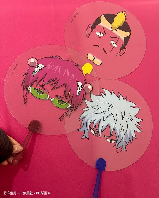 「なりきりうちわ」は顔に当てるだけで「斉木楠雄」「燃堂力」「海藤瞬」になりきれるアイテムです。イベントや写真撮影、ファン同士の交流シーンでも盛り上がれます。