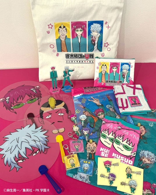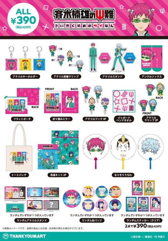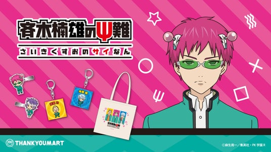 「Be Smile, Be Kawaii」をテーマに、キャラクターの限定アイテムを中心としたカワイイ推しグッズがいつ来てもALL390円で手に入るショップ「サンキューマート」(エルソニック株式会社)は、アニメ「斉木楠雄のΨ難」のオリジナル雑貨を、全国のサンキューマート店舗で5月下旬より入荷次第販売開始いたします。