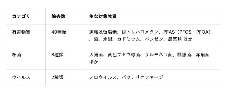 ・家庭用品品質表示法に定められた12種類の法定物質に加え、PFASや細菌・ウイルスまで幅広く除去