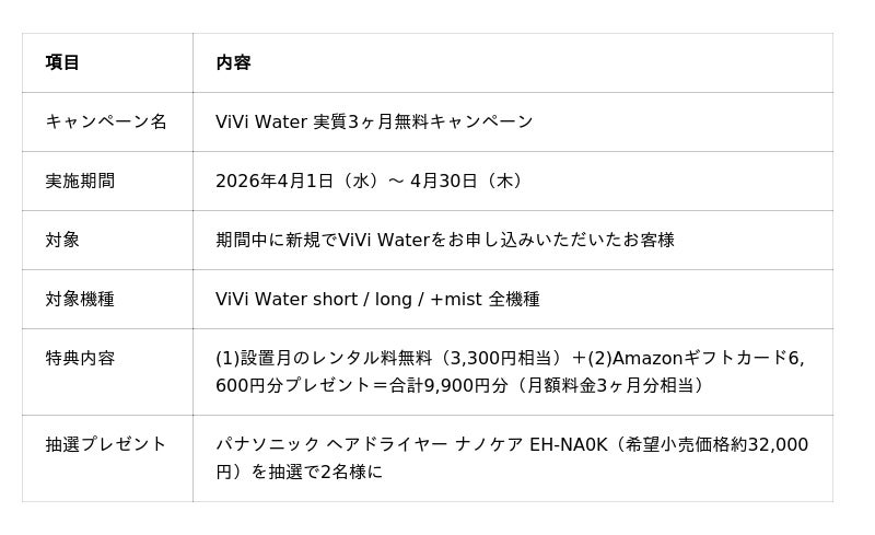 ※キャンペーンの詳細条件については、ViVi Water公式サイト(https://vivi-water.jp)にてご確認ください。
