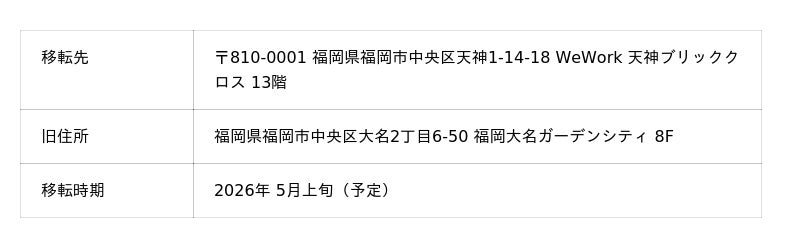 本移転は、九州・福岡エリアにおける保証導入社数の増加、ならびに「敷金半額くん」をご利用いただける登録物件数の拡充を背景とした、事業拡張を目的とする拡張移転です。引き続き、保証と仲介の両面から福岡の企業・スタートアップの成長を支援してまいります。