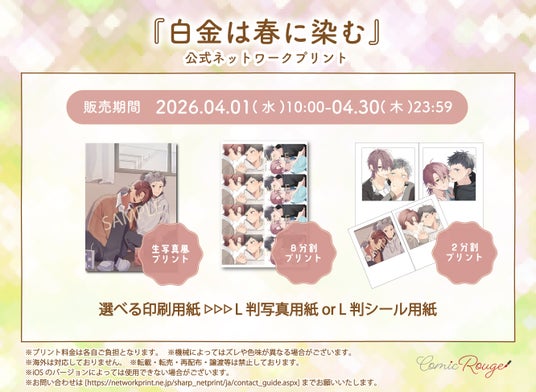 コミックレーベル「コミックRouge」より発売中の『白金は春に染む』の表紙イラスト/キービジュアルが、2026年4月1日(水)AM10:00~4月30日(木)までの期間限定で、プリント支援サービス「公式ネップリ」にてL判サイズでプリントできるコンテンツを販売いたします!