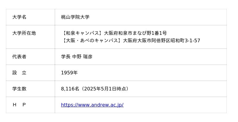 桃山学院大学は、1884年に英国国教会の流れを汲む英学校をルーツとして、1959年に開学し、2024年には学院創立140周年、大学開学65周年を迎えました。課題解決型授業の先駆者的学びのあるビジネスデザイン学部(大阪府大阪市)に代表される実践的な学びに加えて、国際体験プログラムや地域連携、ボランティア等課外活動プログラムも充実しています。