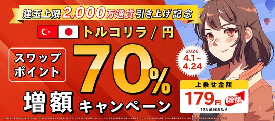 インヴァスト証券株式会社(本社:東京都港区、代表取締役社長:川上 真人、以下「当社」)は、外国為替取引サービス「トライオートFX」において、トルコリラ/円(TRY/JPY)の新規買建玉増加分に対してスワップポイントを70%上乗せしてキャッシュバックする「トルコリラ/円 スワップポイント上乗せキャンペーン」を2026年4月1日~4月24日まで実施します。上乗せ対象となる買建玉数量の上限は10万通貨です。