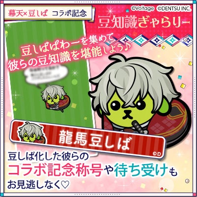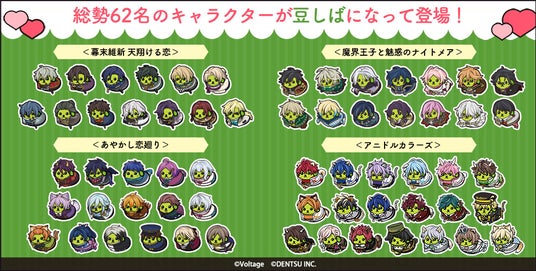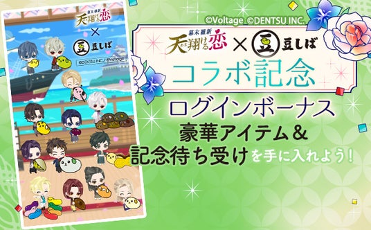 本コラボレーションには、「幕末維新 天翔ける恋」 「魔界王子と魅惑のナイトメア」 「あやかし恋廻り」「アニドルカラーズ」の4作品が参加いたします。「ねぇ知ってる?」のフレーズでおなじみの「豆しば」とのコラボレーションにより、作品の垣根を越えた企画として、総勢62名のキャラクターが“豆しば”となって登場。豪華声優陣によるコラボレーション限定アニメの公開やオリジナルグッズの販売に加え、アプリ内ではコラボレーション記念ストーリーの配信や限定アバターが手に入るガチャなど、多彩な施策を予定しております。