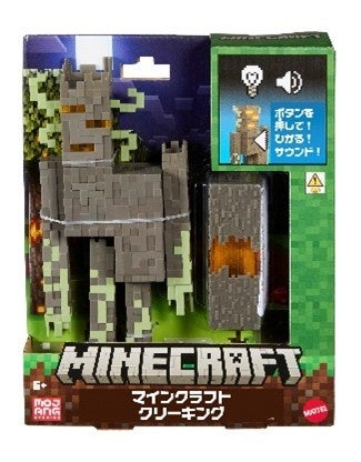 マインクラフトの世界から、敵キャラクター「ザ・クリーキング」が存在感たっぷりのアクションフィギュアで登場します。胸を押すとライトとサウンドが発動し、ゲームさながらの演出が楽しめます。さらに押し続けることで、付属のハートブロックと本体がダメージを受け、破壊モードへと変化します。ゲームでおなじみの舞台を再現しており、遊んでも飾っても楽しめる、マインクラフトファンにおすすめのフィギュアです。