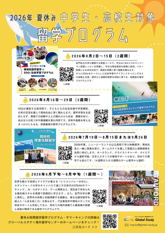 Zenken株式会社(本社:東京都港区、代表取締役社長:林 順之亮、以下 Zenken)が運営するグローバルスタディ海外留学センターは、中学生・高校生を対象とした「2026年夏休み短期留学プログラム」のオンライン説明会を開催いたします。