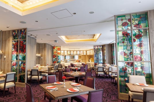 会場は、優雅で幻想的な雰囲気漂うお城のメインダイニングをイメージした「ファンタジーダイニング フルール」。ローズのモチーフがひときわ目を引くステンドグラス風の装飾やキャンドルの温かな照明が煌めく ドラマティックな空間です。心ときめくティータイムを演出いたします。