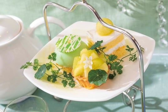 スイーツには、豊かな甘さのメロンを使用した爽やかなミニスイーツが並び、スタンドを華やかに彩ります。