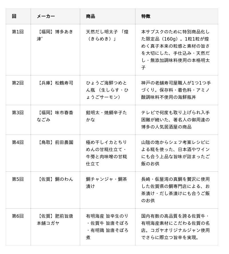 本サービスは毎月1回・全6回、おかわりJAPANが厳選したご飯のお供が届くサブスクです。毎回異なる産地・生産者の逸品が届くため、開けるたびに新しい発見と食の楽しみを感じられることでしょう。