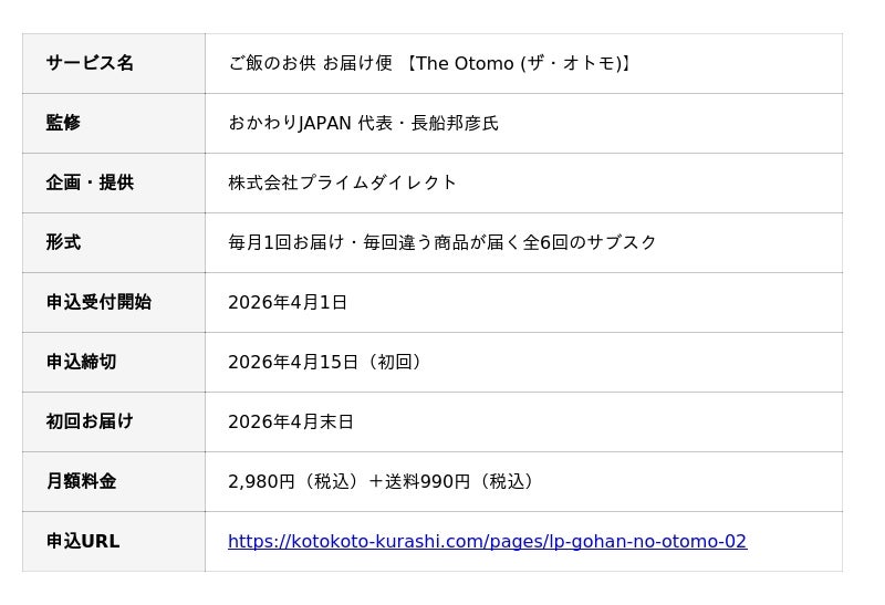 全国各地のご飯のお供を1,500種類以上食べ歩いてきた、ご飯のお供専門メディア「おかわりJAPAN」(代表:長船邦彦)と、Makuakeで目標金額の10,000%超・1,000人超の支援者を集めた伊賀焼レンジ土鍋「伊賀ノ匠」を企画した株式会社プライムダイレクト(本社:愛知県名古屋市、代表取締役社長:森下 英則)は、『ご飯のお供専門サブスクサービスThe Otomo(ザ・オトモ)』を2026年4月より先行申込受付開始することをお知らせいたします。